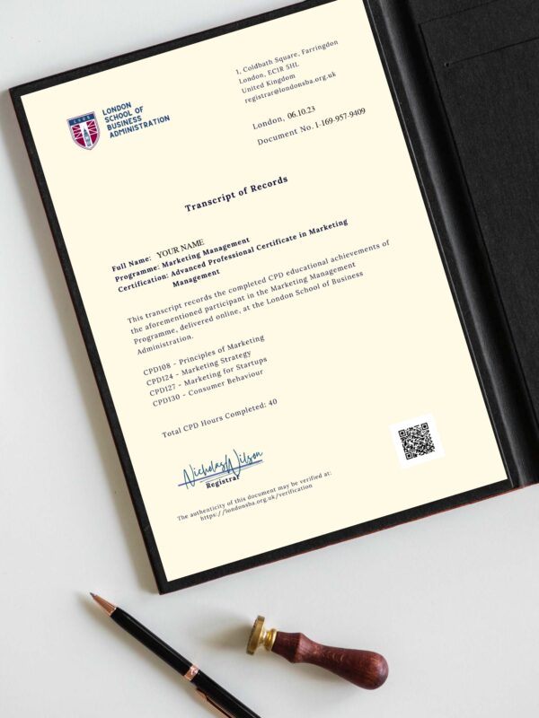 Upon successful completion of all course requirements, participants will be awarded the Advanced Professional Certificate in Marketing Management by the London School of Business Administration.
