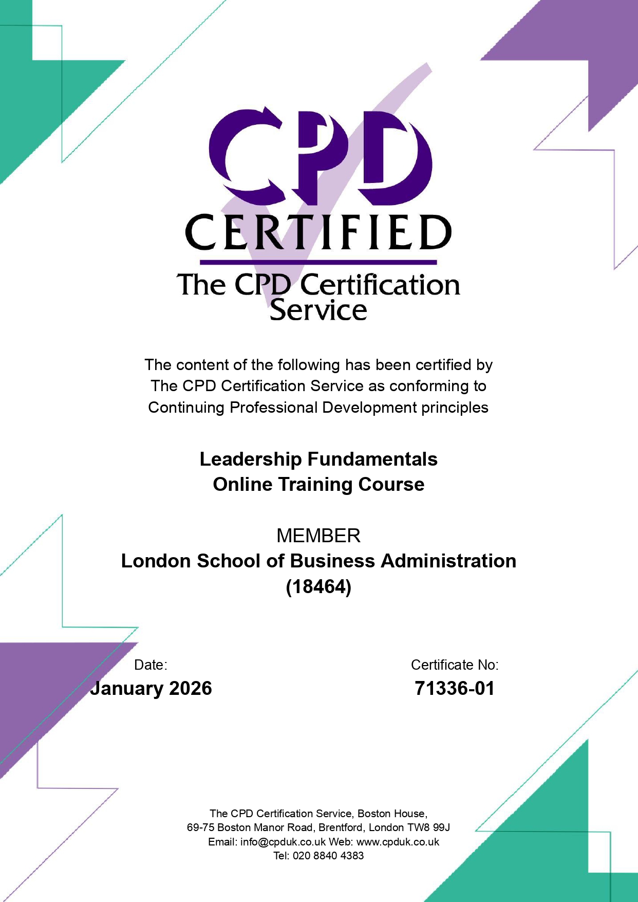 The Leadership Fundamentals course is accredited by the CPD Certification Service, an internationally recognised body that ensures professional training programmes meet high standards of quality, relevance, and continuing professional development best practice. https://www.cpduk.co.uk/courses/london-school-of-business-administration-leadership-fundamentals